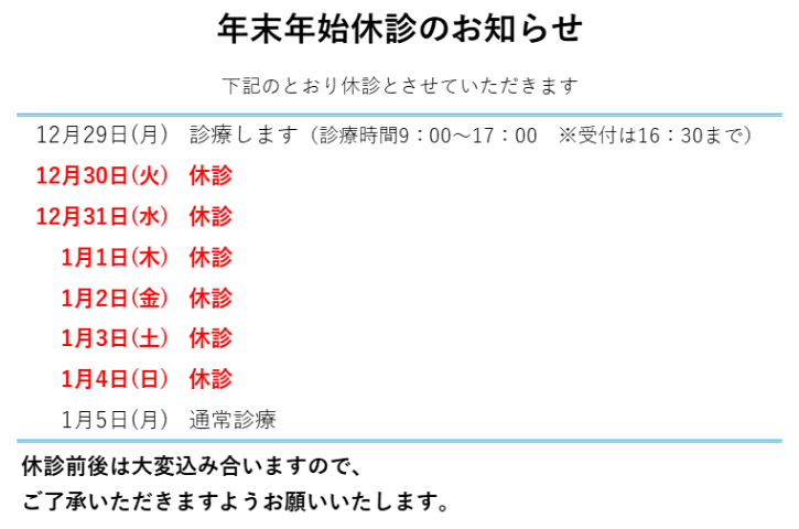 2025年 年末・年始は、下記のとおり休診とさせていただきます