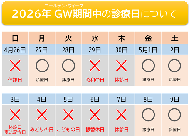 2026年ゴールデン・ウイーク期間中の診療日は下記の通りとなります