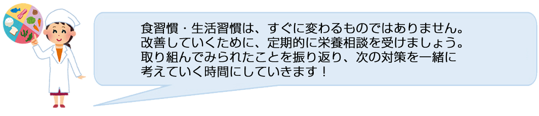 病気のリスクであった食習慣や生活状況の改善、検査値の改善がみられるようになると、状況に応じて1カ月~半年毎と相談期間を決めていきます。