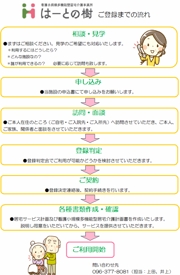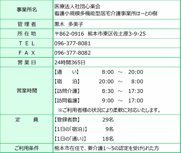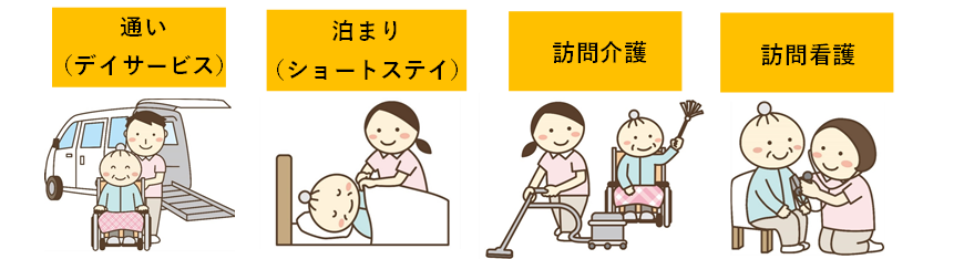 看多機事業所のみで「通い」「泊まり」「訪問介護」「訪問看護」「ケアプラン」のすべてのサービスをご利用いただけます。